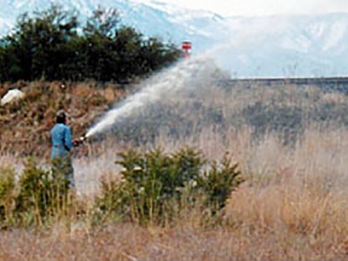 Lime slurry is spread evenly over arsenic tainted ground to be later pulverized in surface treatment of heavy metals.